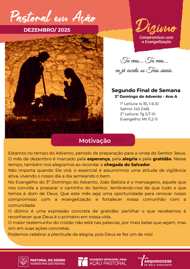 Neste tempo do Advento celebre o Domingo do Dízimo na sua paróquia com o auxílio da publicação “Pastoral em Ação”! A edição de dezembro nos convida a vivenciar a esperança, a alegria e a gratidão pela chegada do Salvador.