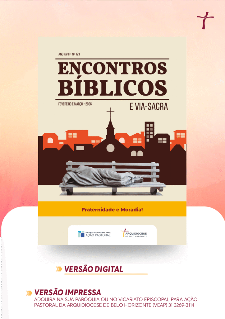 Os Encontros Bíblicos dos meses de fevereiro, março e Via-Sacra nos convidam a olhar com atenção e ternura para o lugar onde vivemos, onde descansamos, onde partilhamos a vida, inspirados pela Campanha da Fraternidade 2026: “Fraternidade e Moradia”. Faça download do seu exemplar: clique aqui e faça seu cadastro!