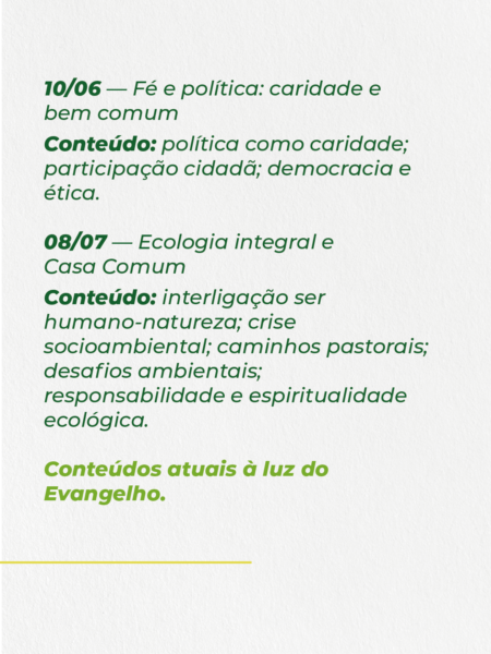 Acompanhe, a seguir, a programação completa do curso e compartilhe esse convite especial com sua comunidade de fé!