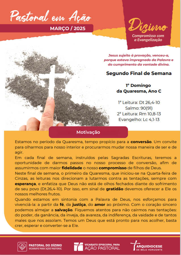 Celebre o Domingo do Dízimo na sua paróquia! O Vicariato Episcopal para Ação Pastoral (Veap) da Arquidiocese de Belo Horizonte e a Pastoral do Dízimo disponibilizam subsídio com reflexão para vivência do Tempo da Quaresma, preces e dicas criativas para envolver a participação dos dizimistas, crianças e fiéis, como sugestão para as comunidades de fé celebrarem a data – no dia 9 de março – 1º Domingo da Quaresma.